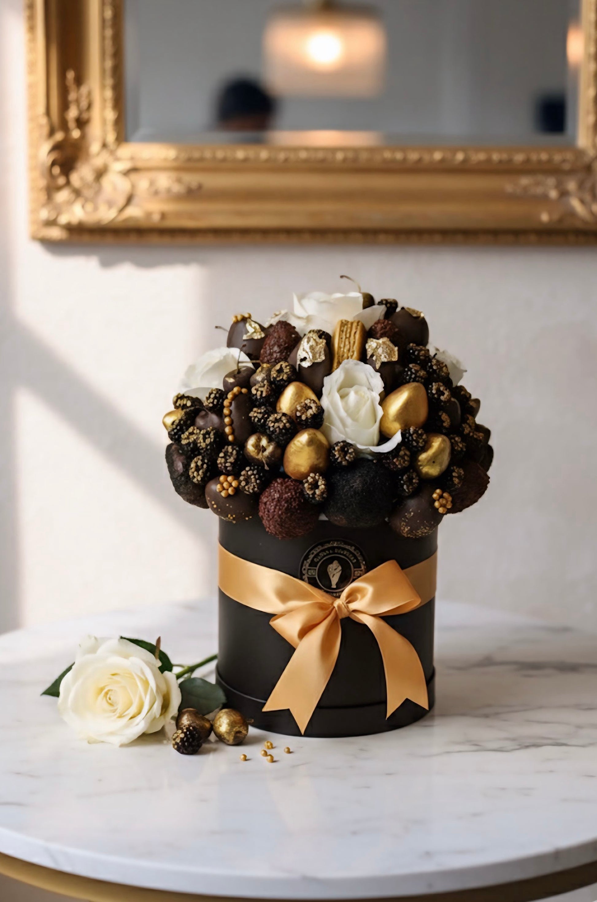 Medium Box: 40 chocolate dipped strawberries,3 macaroons, flowers and berries.