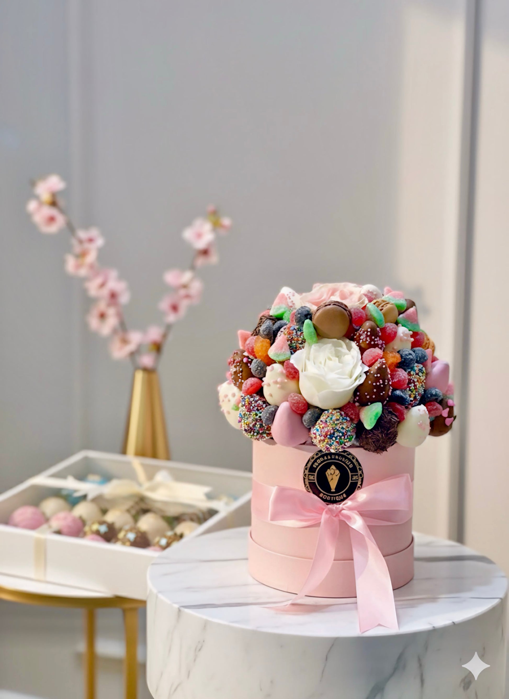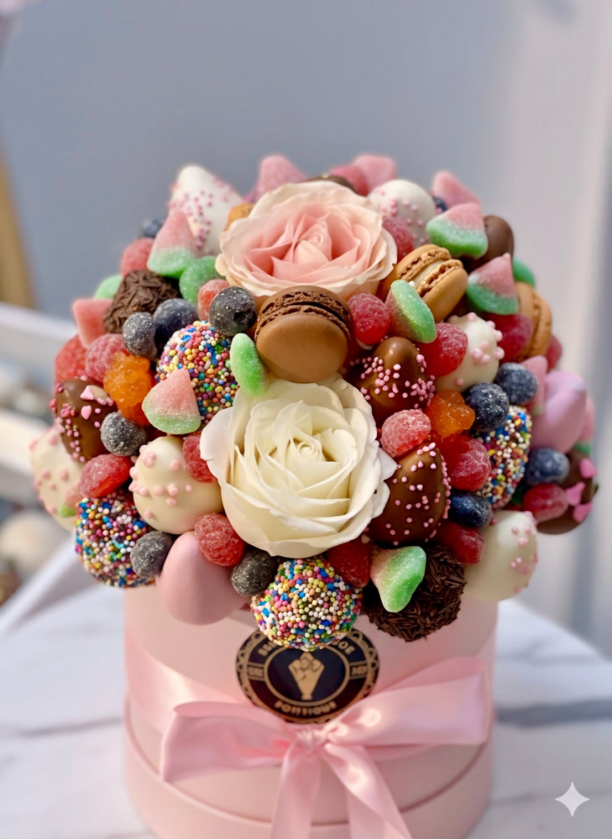 Yummy box for the littles one! Perfect for any occasion. The box comes with chocolate dipped strawberries, gummies, flowers and macarons.