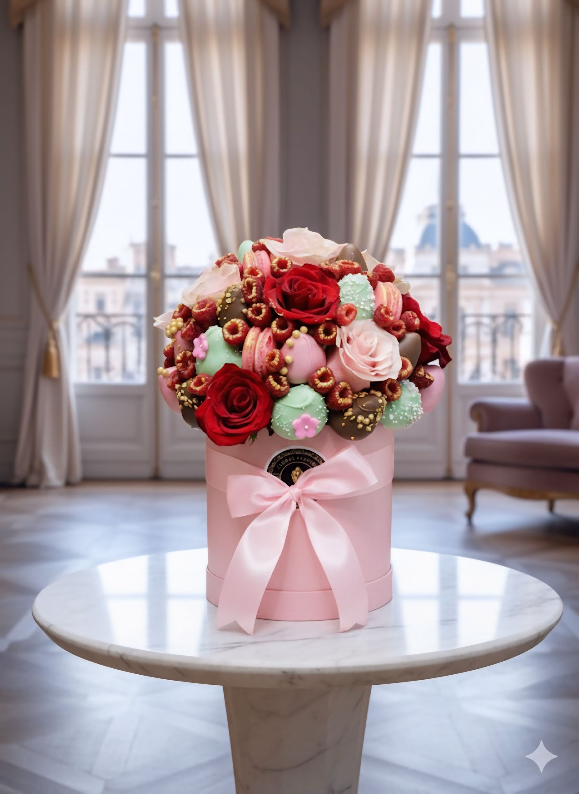 Large Box: 30-35 chocolate dipped strawberries, 5 macarons, flowers and berries.