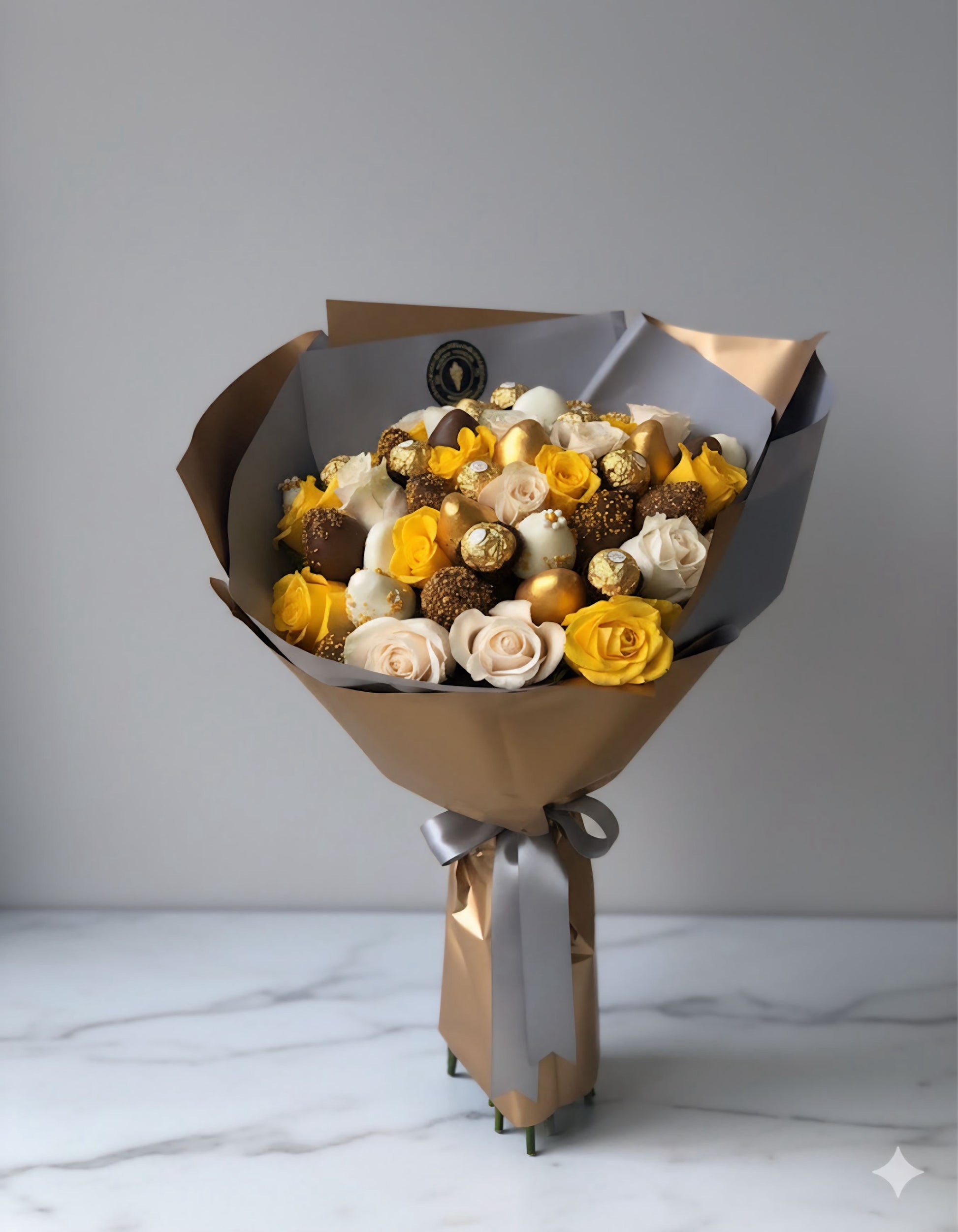 Small Fancy: 12 roses, 12 chocolate dipped strawberries and 3 ferrero rocher chocolates.